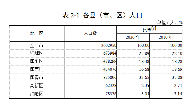 與2010年第六次全國人口普查相比,6個縣(市、區(qū))中,有4個縣(市、區(qū))人口增加。人口增長較多的2個縣(市、區(qū))依次為江城區(qū)和陽東區(qū),分別增加138758人和35537人。