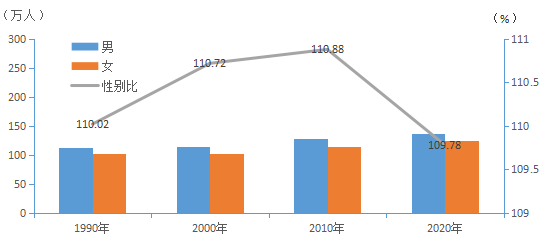 全市常住人口[2]中,男性人口為1362137人,占52.33%;女性人口為1240822人,占47.67 %。總?cè)丝谛詣e比(以女性為100,男性對女性的比例)由2010年第六次全國人口普查的110.88下降為109.78。