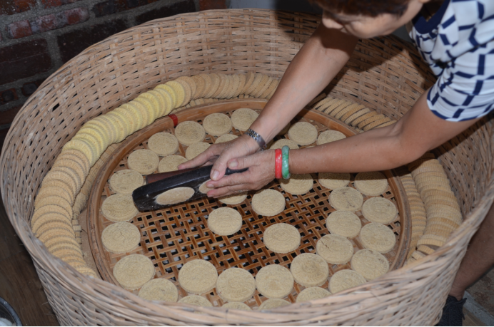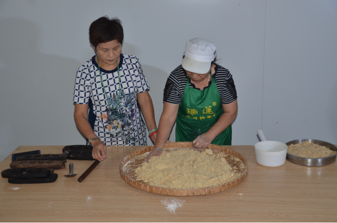 陽江粉酥焙制技藝是一項以炒米粉為主要材料,通過烘焙制作而成的一項傳統(tǒng)餅類食品制作技藝。由陽江人民在生活和習俗中產(chǎn)生、傳承和發(fā)展。陽江粉酥焙制技藝有選料、炒米、磨粉、配料拌合、上印制作、烘焙、起焙裝缸工序。