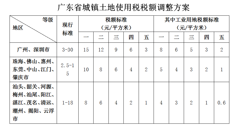 廣東省城鎮(zhèn)土地使用稅稅額調(diào)整方案