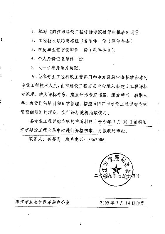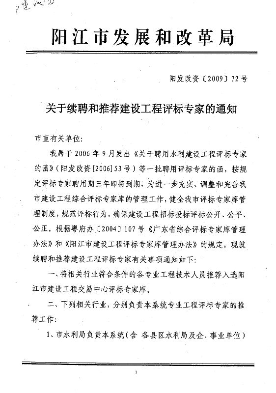 現(xiàn)將市發(fā)展改革局《關于續(xù)聘和推薦建設工程評標專家的通知》(陽發(fā)改資[2009]72號)轉發(fā)給你們,請認真按照《通知》要求做好本地本單位的房屋建筑和市政基礎設施工程評標專家推薦工作,并于今年8月20日前將符合條件的人員名單及有關資料報送市建設局招標辦。